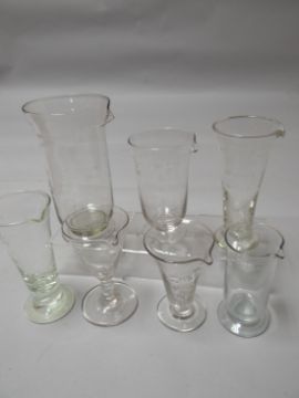 Seven nineteenth century and early twentieth century glass pharmacy measures