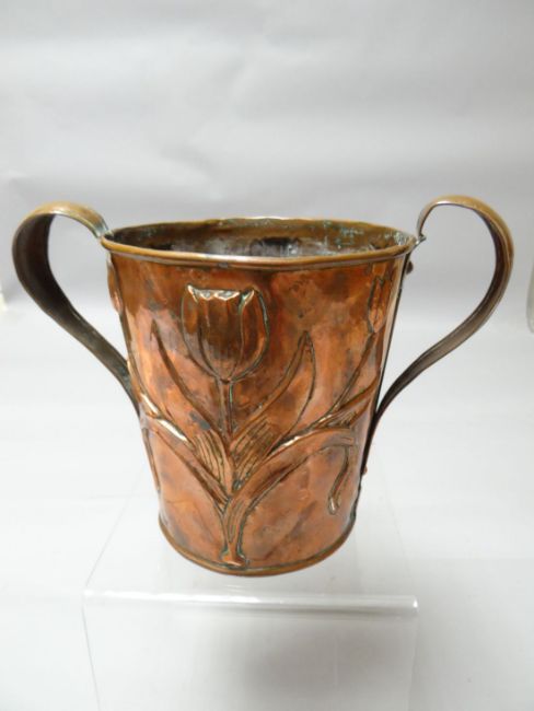 A rare copper arts and crafts copper twin handled planter with embossed floral metal work produced by the Yattendon Class (the s-shaped handles are typical of this school), 9 ins high (23 cms)