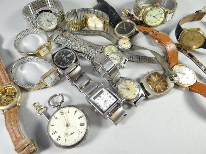 A silver pocket watch and a collection of mixed wristwatches, (list available as the watches have been collected by donors to a charity, please note that the Rolex is not genuine)