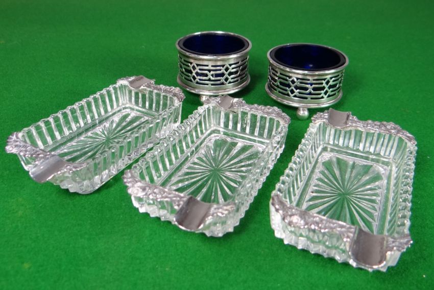 A trio of silver mounted cut-glass ashtrays; together with two circular footed silver mustard salts of pierced form and with Bristol-blue glass liners