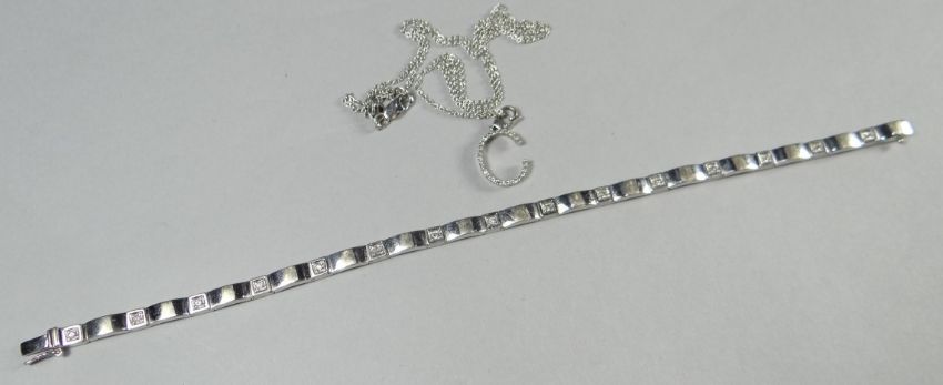 A contemporary 9ct white gold reticulated bracelet set with tiny diamonds; together with a fine necklace attached to a three-quarter hoop pendant with tiny diamonds, 12.39 gms total