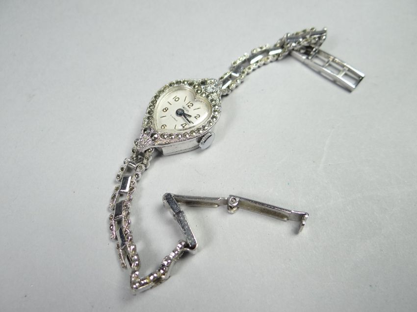 A vintage SMITHS white metal marcasite ladies cocktail wristwatch with heart shaped dial, in Smiths box
