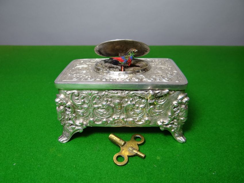 A German EPNS singing-bird automaton, the case highly embossed in the Baroque style with scrolls, masks and with figural corner supports, the oval lid operated by a key and a sliding bird to the obverse, EB initials to the base, believed to be for Emil Brenck, 4 ins wide (10 cms) (Condition: working intermittently, structurally sound and complete with key, bird chirps but wings of bird do not flap)