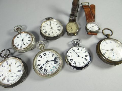 A cigar box containing two hallmarked silver pocket watches, a white metal pocket watch with engraved depiction to the case, three mixed pocket watches and three vintage wristwatches