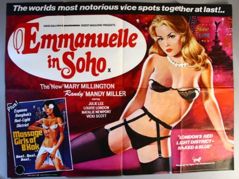 Two British Quad Original film posters "Emmanuelle in Soho" Tigon Films "X" certificate with Tom Chantrell artwork plus "Goodbye Emmanuelle" "X" certificate