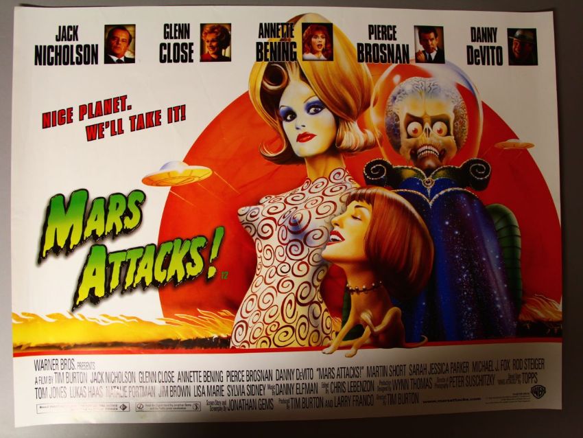 Over 250 Rolled British Quad cinema posters including "Mars Attacks" Directed by Tim Burton, The Dictator, Woody Allen, The Hunter, The look of Love, Deadfall, Spongebob, The Crucible, 21 Jump Street, Sessions, Jackpot, The Kids are Alright etc (condition A)