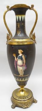 An early twentieth century black basalt and gilt metal mounted twin-handled table-lamp, painted with a Classical figure either side and both carrying Roman wares as reference, probably by Wedgwood, 19 ins high (49 cms) (severe damage)