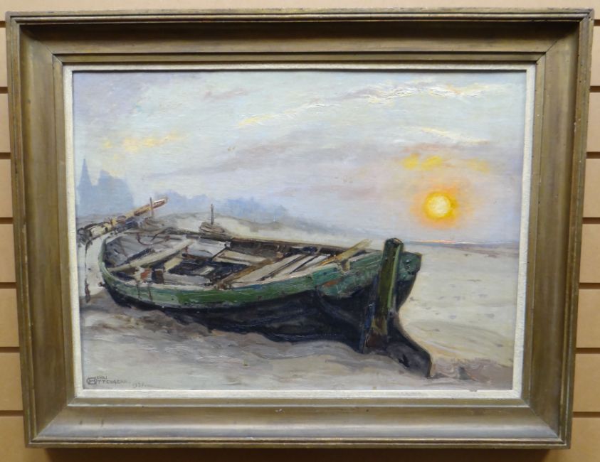 OIL ON BOARD: Henri Ottevaere - beached boat at sunset, signed and dated 1937 and with original title label verso 'Barque a Honfloeur', (Provenance: in the long established ownership of the family of our Dutch vendor client) 18.75 x 25.75 ins (48 x 65 cms) FRAMED AND MOUNTED