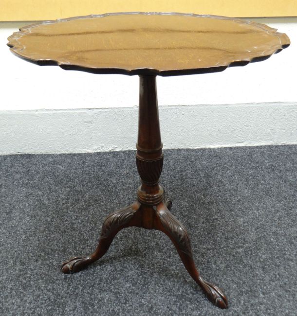 A tilt-top mahogany tripod-table with shaped and galleried top on fluted taper column support above carved hoof feet, 23 ins diam (58 cms)