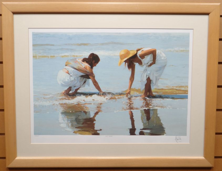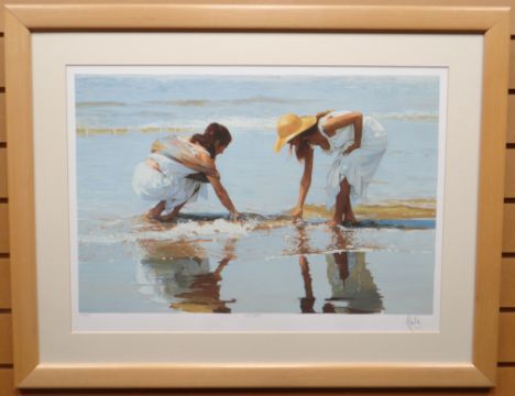 ORIGINAL SERIGRAPH PRINT: Luis Ribas, two ladies on the shore entitled 'Shell Seekers', signed, 18.5 x 26 ins (47 x 66 cms) FRAMED AND MOUNTED