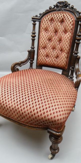 A good Victorian stained open-armchair of elaborate carved form and with classic red diamond-raised upholstery to the seat and to the buttoned arch-shaped back and with original ceramic casters marked C&C Patent
