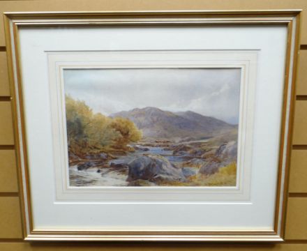 WATERCOLOUR: W Artingstall RCA - mountainous river scene with drover and cattle, 9 x 13 ins (23 x 33 cms) IN GILT FRAME & MOUNT