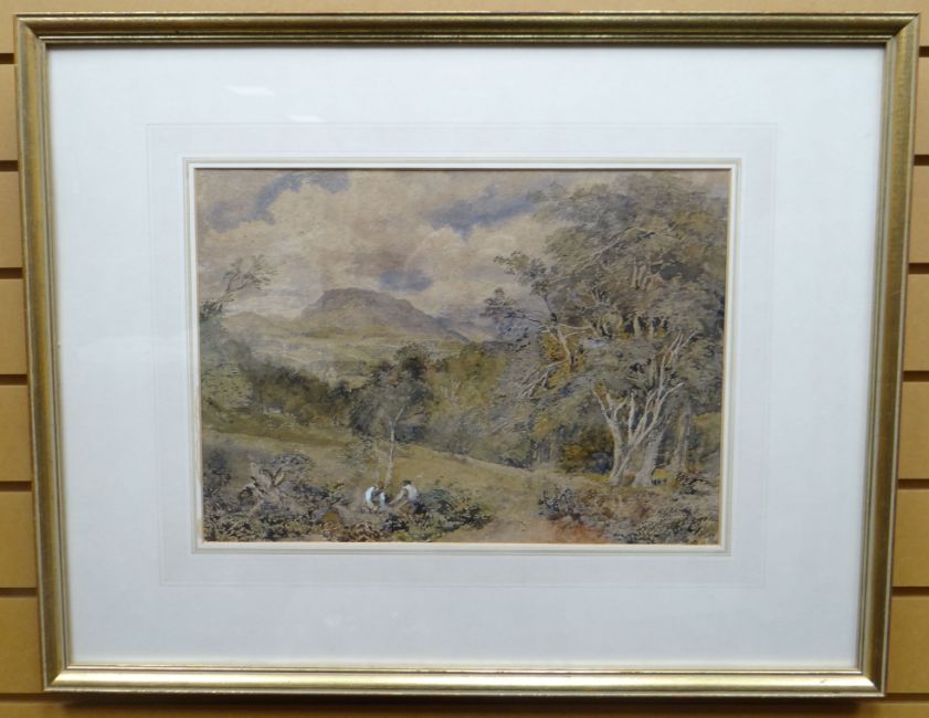 WATERCOLOUR: David Cox Jnr - expansive landscape with two woodcutters near a glade, signed and dated 1880, and with original label verso for Sanders of Oxford, 13 x 18.25 ins (33 x 46 cms) MOUNTED AND FRAMED