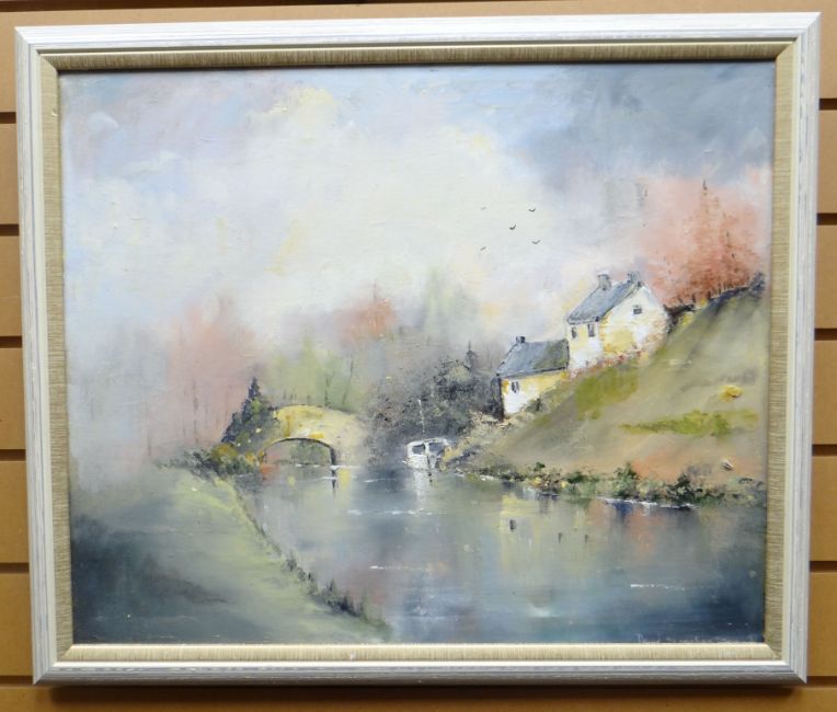 OIL ON CANVAS: D Shanahan - river scene with houses and bridge, signed, 19 .25 x 23.5 ins (49 x 59 cms) FRAMED