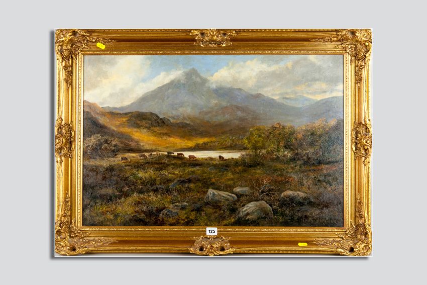P KILNER oil on board - lake and mountainscape with cattle feeding, signed, 50 x 75 cms