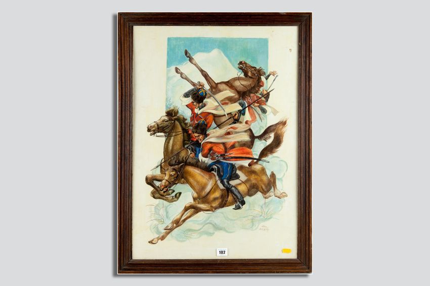 Russian School watercolour - three Cossack horsemen riding into the clouds with weapons drawn, signed, 69 x 49 cms
