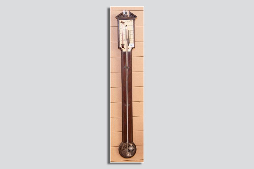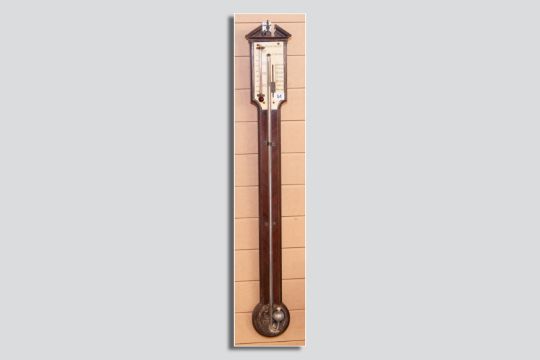 A mahogany stick barometer with boxwood stringing and ivory slip dial, signed 'Poncione, London', requiring some restoration, 39 ins (99 cms) long