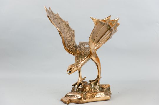 A 20th Century polished bronze sculpture of a mythical bird standing on a rocky base, its wings outstretched (very heavy, care when viewing), 20 x 16 ins (51 x 40.5 cms)