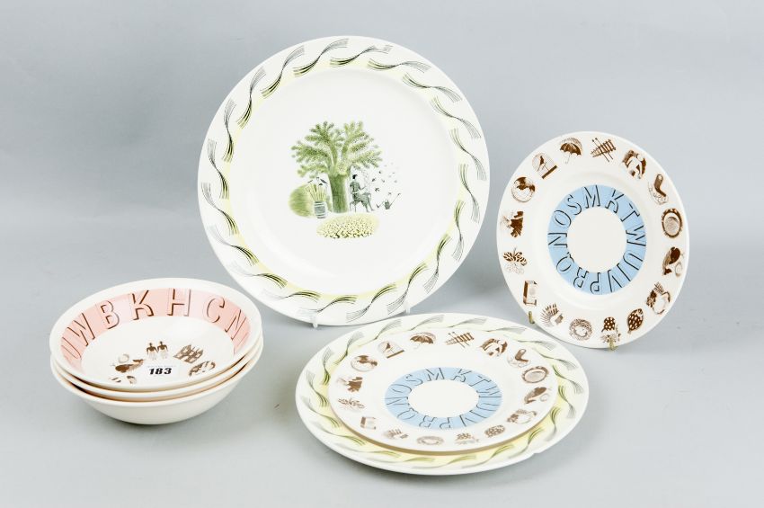 A group of Wedgwood pottery after designs by Eric Ravilious to include a 10 ins plate, a 9 ins plate 'Garden' pattern, three later bowls in 'Alphabet' pattern, two 7 ins plates 'Alphabet' pattern (some chips and surface scratching)