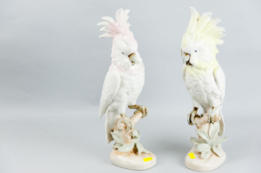 A pair of Royal Dux porcelain models of cockatoo standing on a branch amongst foliage, one with pink and white raised head feathers, the other yellow and white, pink raised triangle mark to the base and underglaze printed mark 'Hand Painted, Made in Czech Republic' and a series of numbers impressed, 16 ins (41 cms) high