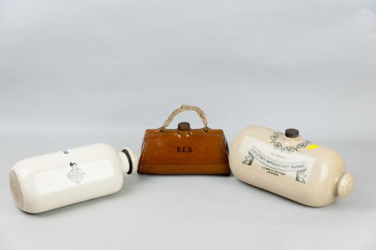 Three decorative stoneware bedwarmers including one coloured and shaped like a Gladstone bag, made by Bourne, Denby