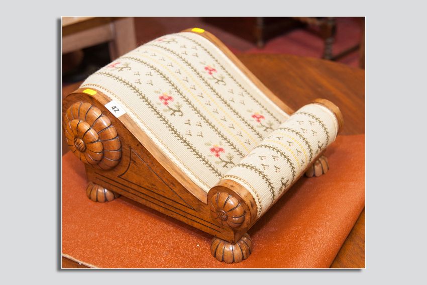 A nice quality modern mahogany footstool in the antique style, the shaped stool with applied petal carvings mirroring bun feet and tapestry upholstery, 16 ins (40.5 cms) wide