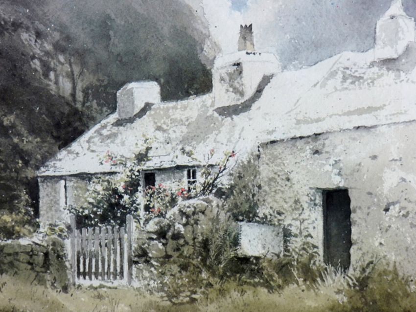 KEITH ANDREW coloured print - cottages, Caeau Gwynion, Anglesey, signed, 8.75 x 10.75 ins (22 x 27 cms) and a coloured limited edition (167/850) print - old farmstead with farmer and machinery, signed, 6.75 x 9.5 ins (17 x 24 cms)