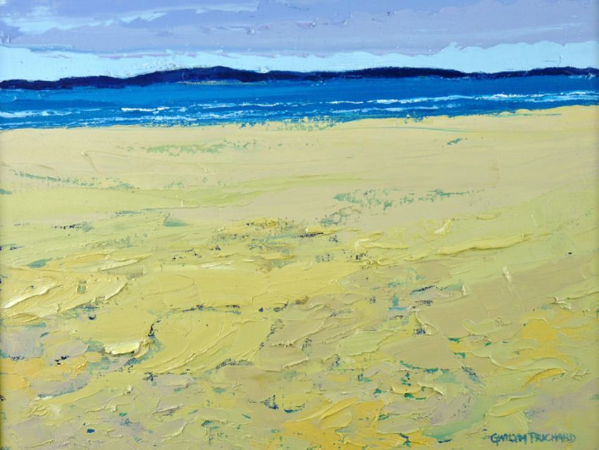 GWILYM PRICHARD oil on canvas - coastalscape, Caldy Island, signed and signed and dated verso 2000 with title label ‘Ynys Bwr’, 14.25 x 17.25 ins (36 x 44 cms)