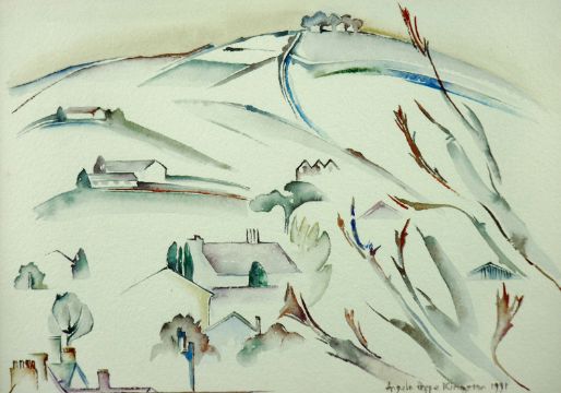 ANGELA HOPE-KINGSTONE mixed media - seated figure with a cat in lap, signed and dated 1992, 4.75 x 5.5 ins (12 x 14 cms) and mixed media watercolour - hillside rooftops and fauna, signed and dated 1991, 5.5 x 7.75 ins (14 x 19 cms)