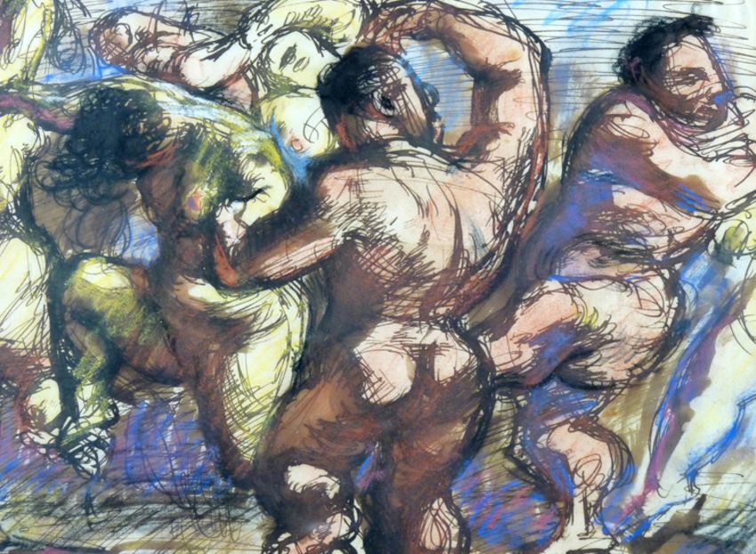 T R ROTHWELL watercolour/mixed media - study of dancing nude figures, signed and - ‘There are figures at the bottom of my garden’, 9.5 x 14.25 ins (24 x 36 cms)