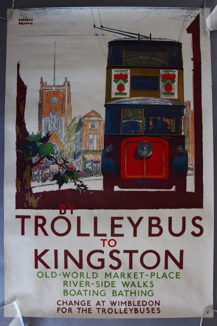 Two Rolled Travel posters one for "By Trolleybus to Kingston" (20 x 30 inch) artist Gregory Brown and a later print from 1983 " The Hop Gardens of Kent by Motorbus" art by Dorothy Dix, (23 inch x 35 inch) (Condition A)