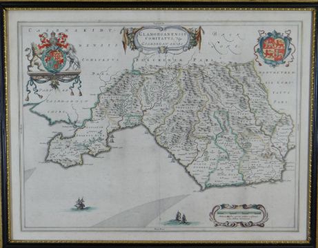 JOHAN BLAEU antique coloured map of 'Glamorgan Shire' 16.5 x 21.5 ins (41 x 54 cms)