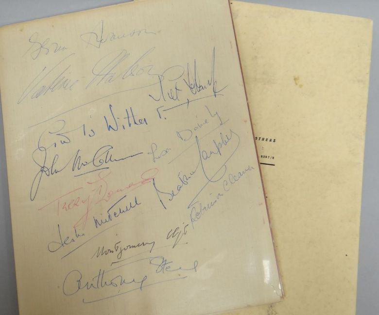 Of Cardiff interest - a Royal Film Performance programme at Empire Theatre, Cardiff, 1950, the reverse signed by entertainers of the period including Terry Thomas, Gloria Swanson, Montgomery Cliff, Petula Clarke; together with Souvenir Programme of the Midnight Matinee, 1957 at the Gaumont Cardiff, signed by two others
