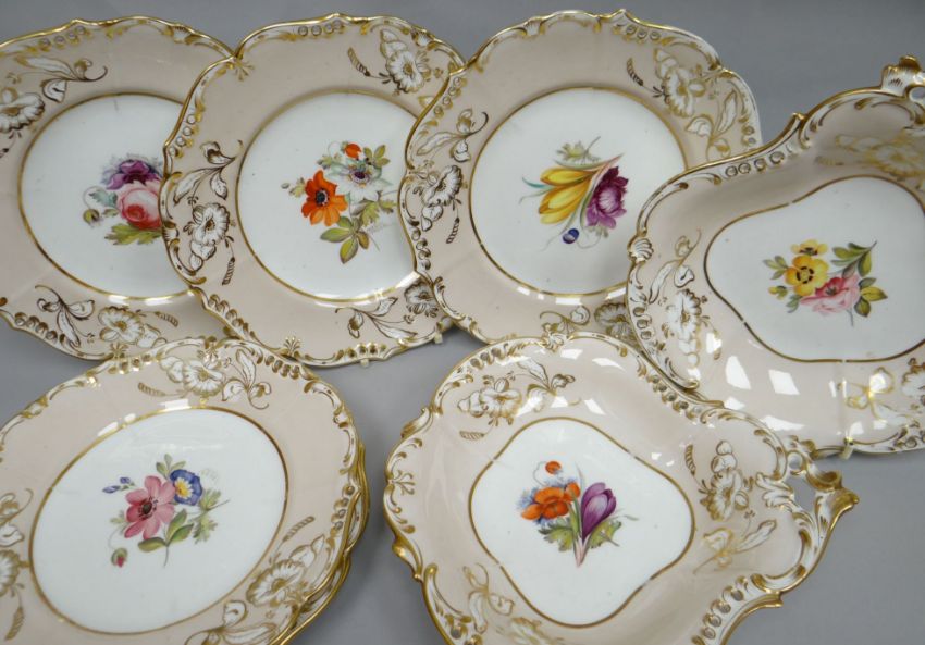 An eight-piece Coalport dessert part-service comprising five plates (9 ins diam) and two dishes (10 ins wide), each with shaped, pierced and gilded floral borders on pink ground and with white ground interiors painted with central sprigs of summer flowers, circa 1830s. Note: Pattern number 3/597 to the base (corresponding to illustration plate No.136 on page 136 of Michael Messenger's 'Coalport 1795-1926' (Antique Collector's Club 1995)