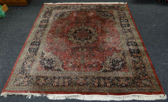 A rust and cobalt blue intricately patterned Persian wool carpet, 100 x 118 ins (253 x 299 cms)