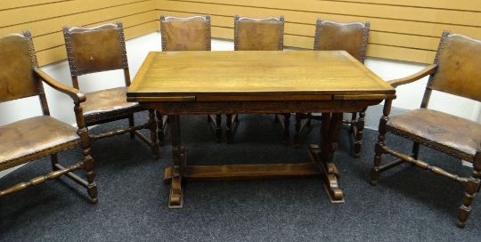 An oak refectory table and six chairs. Comprising excellent twentieth century reproduction of a Jacobean-period table with carving to the frieze and lyre-shaped supports and with centre floor stretcher, 79 x 31 ins (201 x 79 cms), together with 4+2 chairs with buttoned tan leather seats and similar backs and on turn-and-block supports