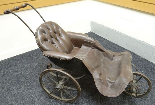 A Victorian coach-built three-wheel bath-chair on iron-springs, with buttoned brown leather seat, turned handle and iron non-pneumatic tyres having wooden spokes (some damage), 51 ins long (130 cms)
