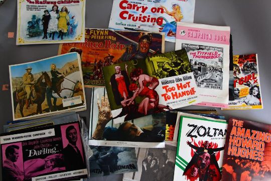 A collection of cinema memorabilia including Front of House sets, Campaign books and posters. Original "Shalako" starring Sean Connery 7 US lobby card set (11 x 14"), "The Dark Avenger" Errol Flynn original Belgian film poster (13 x 21 inch), Campaign books for "The Railway Children", "Carry on Cruising", "The Titfield Thunderbolt", Daleks Invasion Earth, Lust for a Vampire, The Wicker Man (lobby card), The Elephant Man (full set of 8 UK lobby cards), Death is a Woman, Zoltan, The Man who fell to Earth, The Amazing Howard Hughes, The Man who Haunted Himself, Cat Girl, Darling etc. Various Conditions