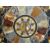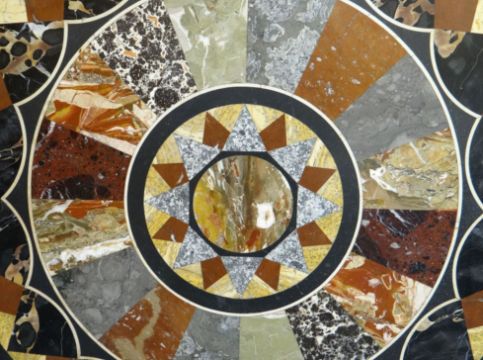 A circular specimen centre-table. The marble inlaid in a radiating geometric design upon a tripod base with sweeping metal supports and centre circular stretcher with acorn finial, 27 ins diam (69 cms)