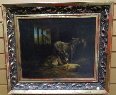 TWENTIETH CENTURY SCHOOL oil on board - interior of barn with two donkeys and a reclining pig, unsigned, 14 x 17.5 ins (36 x 44 cms)