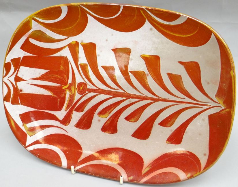 An Aldermaston studio-pottery platter by Alan Caiger-Smith, decorated in ruby and silver luster with a fern design, letter marks to the base, 15 ins long (38 cms)
