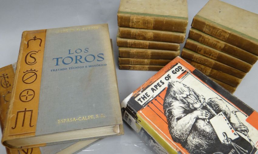 Books: de Cossio, Jose Maria: Los Toros (vols 1 and 3 (of 4)) Published by Espasa-Calpe in 1943 as the First edition. Front board to volume I stained. Copious plates and diagrams related to bullfighting. Johnson, Samuel: The Works of Samuel Johnson, LL. D. (12 vols) Published by W Baynes & Son et al in 1824. A matched set in original boards with hessian spines. Contemporary bookplates of William L Colquhoun of Clathick Lewis, Wyndham: The Apes of God Published by Arco Publishers in 1955 as number 713 of a signed limited edition of 1000. Complete with dustwrapper
