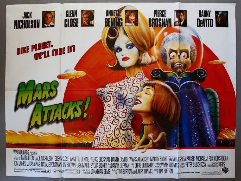Sixty plus folded British Quad film posters including Mars Attacks plus Wyatt Earp, Jumanji, Outbreak, JFK, Fargo, Barton Fink, Four Weddings and a Funeral, Waterworld, Showgirls, The Mask, Last of the Mohicans, Othello, Ace Ventura, Falling Down, Little Rascals, Braveheart, Heat, Single White Female, Casino etc. Mostly A Condition Double-sided