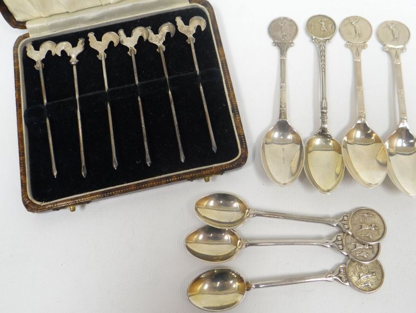 A cased set of six Sterling silver cocktail sticks with cockerel tops; together with a set of seven harlequin silver tea-spoons having circular pictorial handles of lady golfers in various poses, 4.3ozs total
