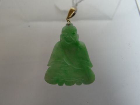 A Chinese carved jade pendant in the form of seated sage with yellow believed gold link