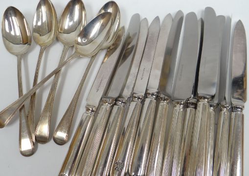 A set of five George III silver dessert spoons, London 1796, 4ozs; together with two sets of Sheffield knives