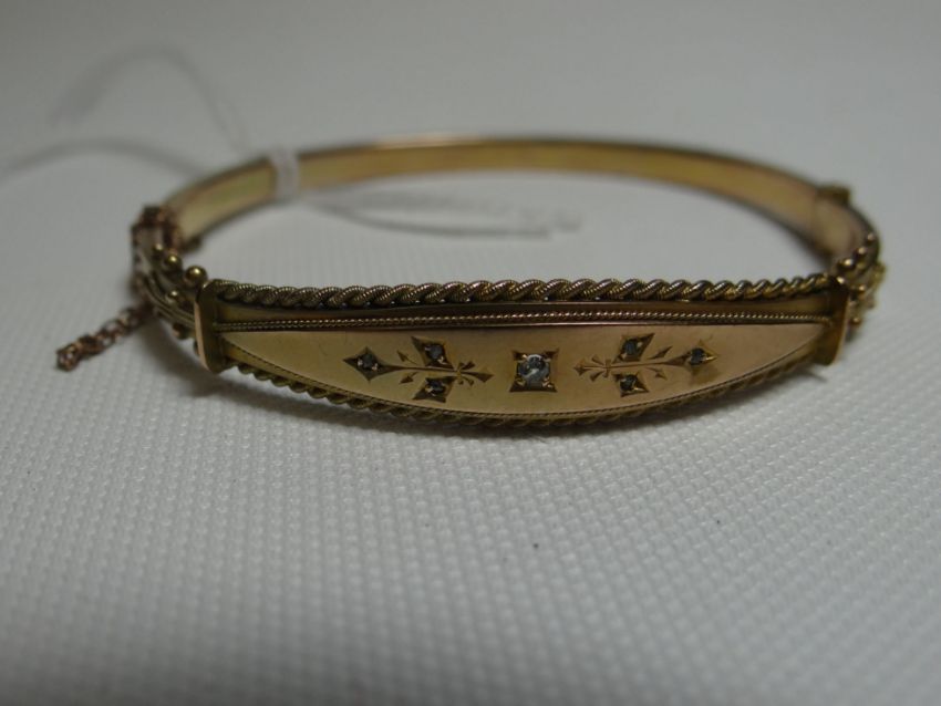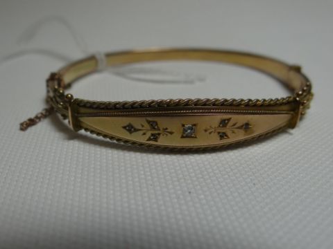 A 9ct yellow gold clasp-bangle with central rope-twist bordered fascia set with single diamond, 7.43gms