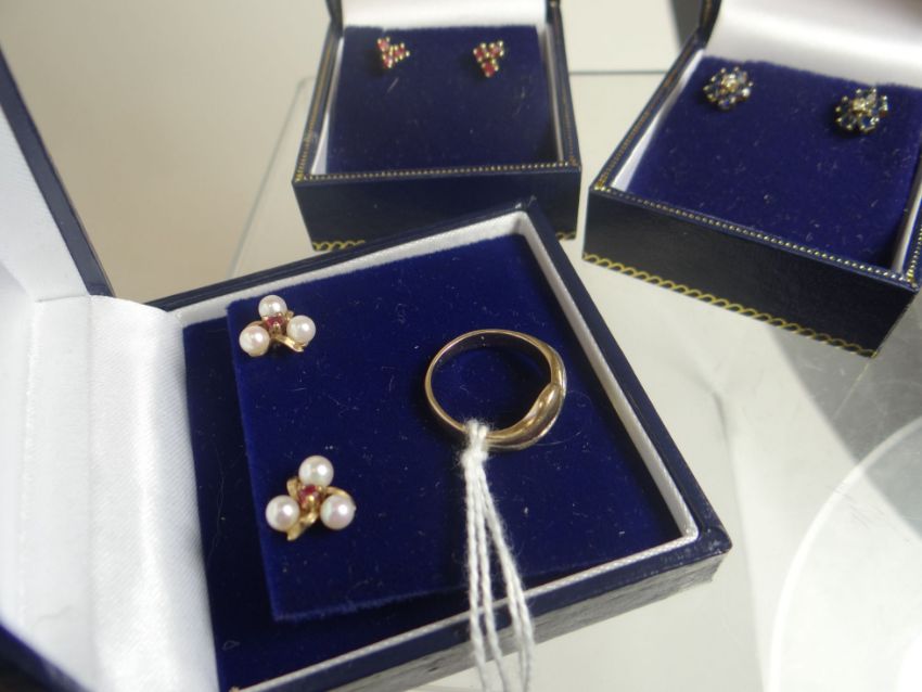 Three pairs of earrings and a 9ct yellow gold ring, 3.2gms