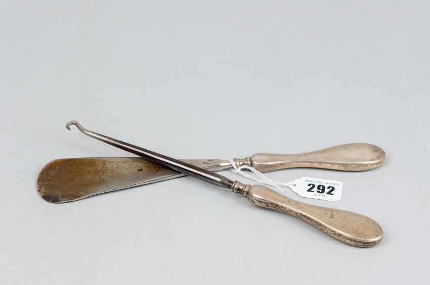 A long silver handled shoe horn and hook pair