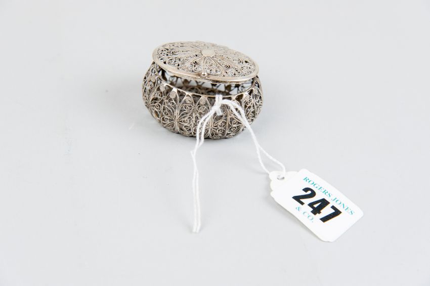 A ring box - an oval white metal filigree ring box with hinged lid, 0.5 ozs